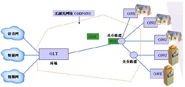 ODN是光分發(fā)網,由無源光纖分支器和光纖構成。無源光纖分支器是連接OLT和ONU的無源設備,它的功能是分發(fā)下行數據和集中上行數據。無源分光器的部署相當靈活,由于是無源器件,幾乎可以適應于所有環(huán)境。一般無源光纖分支器的分光比有1:2、1:4、1:8、1:16、1:32、1:64等。一般建議采用一級分光,多不能超過二級分光。